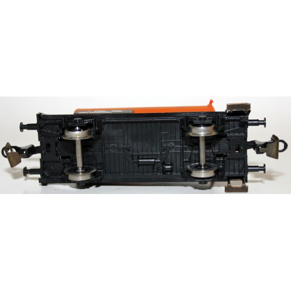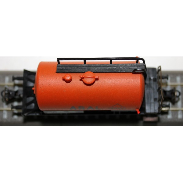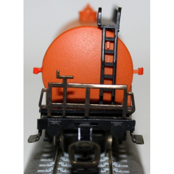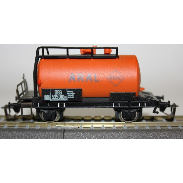 2-osiowa pomarańczowa cysterna koncernu Aral kolei austriackich ÖBB w skali 1:120 produkcji Berliner TT Bahnen. Wagon kompletny w detale i wystające elementy (szczęki hamulcowe, barierki, uchwyty pod latarnie); metalowe koła.
